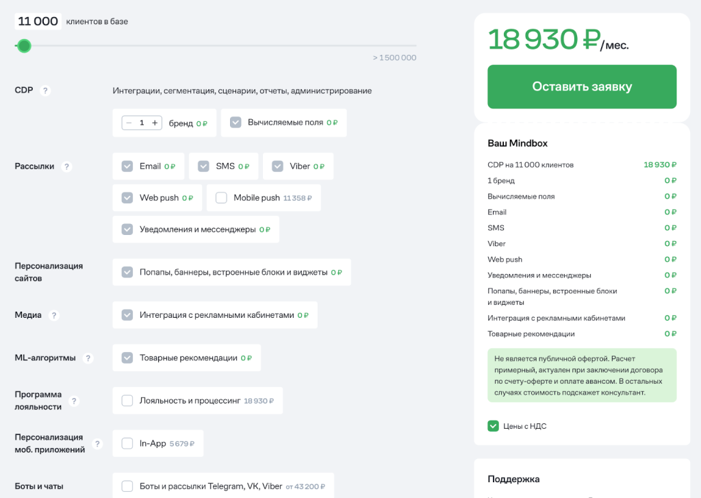 - Стоимость платформы начинается от 18 930 ₽/мес за базу около 11 000 контактов.