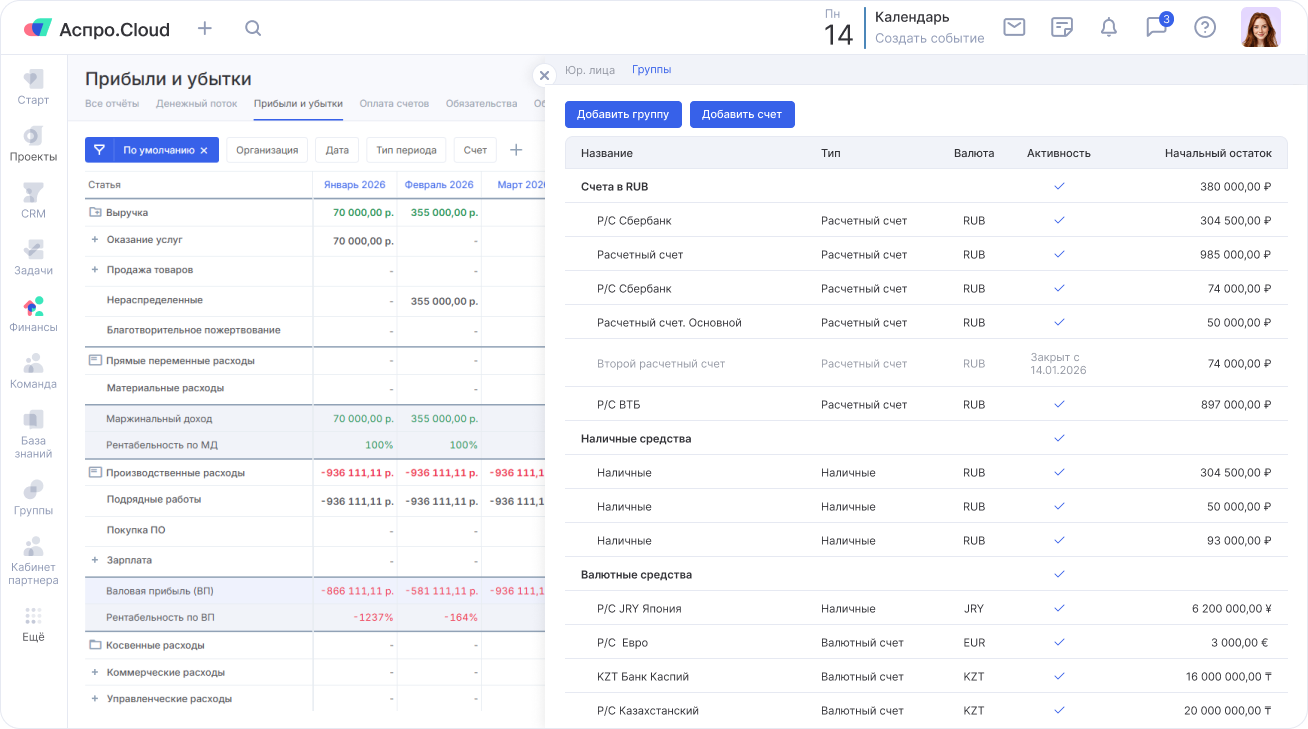 Интеграция CRM с банком позволит автоматически загружать платежи в систему. Автоматизируйте процесс обработки счетов и работу с проектами и управляйте финансами. Сэкономьте время на внесение данных о поступлениях вручную. CRM-система самостоятельно найдет документ по номеру счета в платежном поручении и отметит его как опаченный. Также Аспро.Cloud автоматически прикрепит платеж к активному проекту с контрагентом.