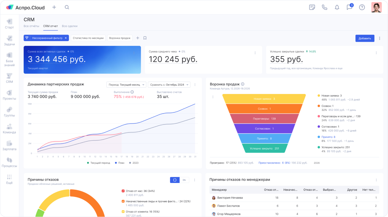 CRM-система Аспро.Cloud позволяет автоматически создавать акты, счета и коммерческие предложения. Это упрощает документооборот для менеджеров, а также учет финансов: каждый выставленный счет поступает в систему. Платеж также можно привязать к проекту, если это плановая оплата работ. Отдельный отчет поможет отследить, кто из клиентов уже внес средства, а кто — нет. Подключите платежные системы, чтобы заказчик смог оплатить счет прямо из письма.
