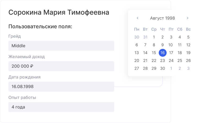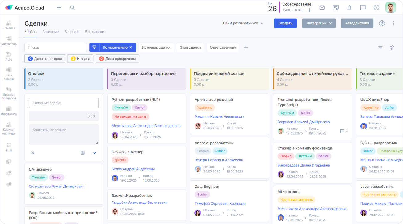 Конечно! Сервис Аспро.Cloud автоматически собирает данные из воронки подбора персонала и формирует подробный отчет. В нем вы можете увидеть конверсию в оффер и причины отказов по отдельному HR-специалисту или всем сотрудникам. Также можно проанализировать воронку по конкретной должности. А чтобы всегда держать руку на пульсе, выведите динамические виджеты на рабочий стол.