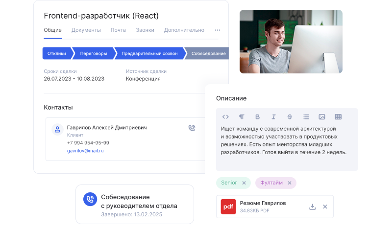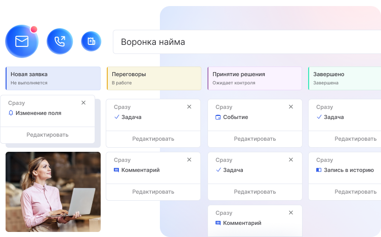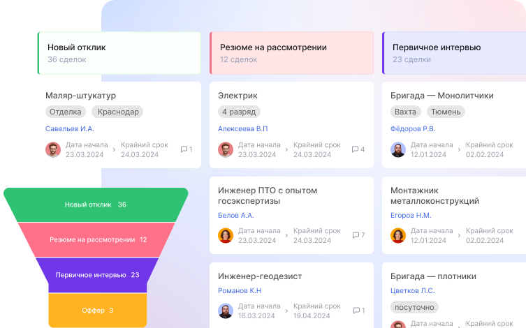 Воронка кандидатов — программа, которую можно внедрить очень быстро благодаря интуитивно понятному интерфейсу. Достаточно создать карточки кандидатов или импортировать их из другой системы, а также настроить этапы воронки подбора и автодействия. Этого достаточно для полноценной работы с вакансиями.