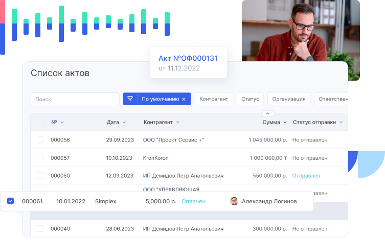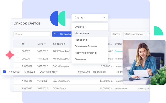 Сортируйте счета по менеджерам, контрагенту, дате создания и статусу. Это поможет быстро найти нужный документ, отследить просроченные счета и при необходимости напомнить клиенту об оплате.