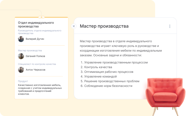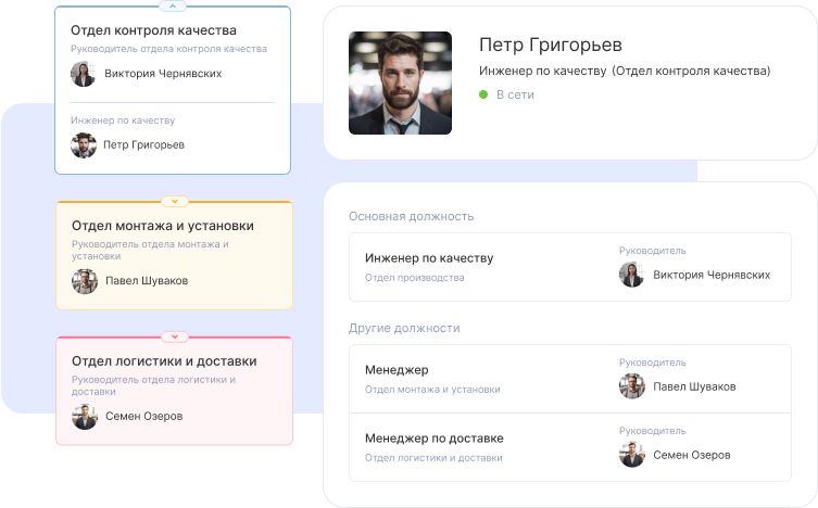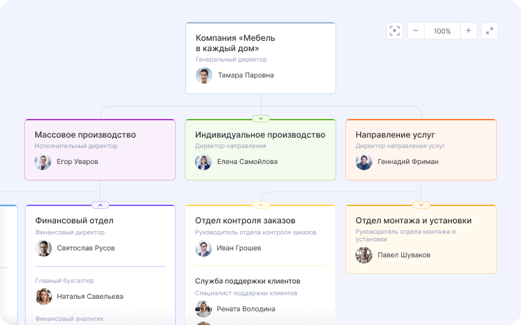 Работник увидит в организационной диаграмме все направления, отделы, позиции и связи между ними.