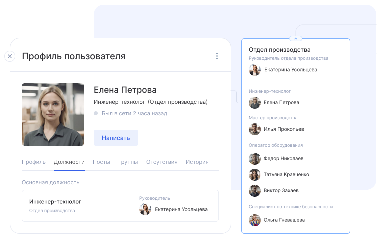 - Быстрый доступ к информации о работниках. Из организационной схемы можно сразу перейти в профиль любого человека и посмотреть его данные: должность, контакты и соцсети.