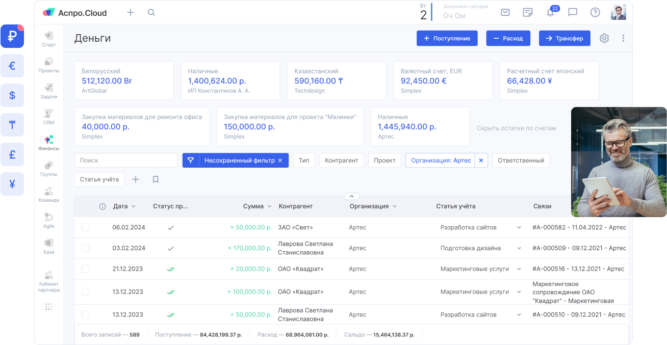 Назвать Аспро.Cloud CRM с финансовым учетом будет некорректно. Это комплексная система управления бизнесом. То есть в нее входит и CRM, и система управления проектами, и сервис финучета. Таким образом, Аспро.Cloud заменяет сразу несколько сервисов, необходимых современной компании.