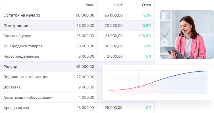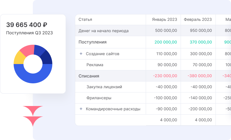 Отслеживайте остатки на счетах, движение денег по направлениям и анализируйте расходы. Система поможет учесть каждую операцию и распределить их по статьям учета.
