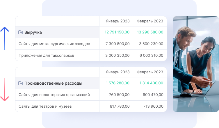 Составьте бюджет доходов и расходов, чтобы сравнить план с фактом и отследить эффективность бизнеса. Понятные графики покажут общую картину, а детализация по статьям учета поможет разобраться в причинах отклонений.