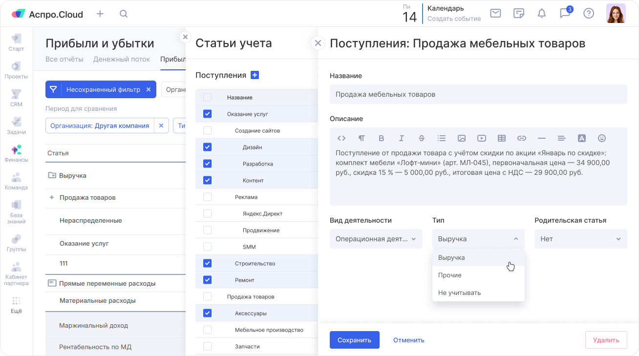 Вы можете попробовать сервис финансового учета Аспро.Cloud бесплатно в течение 14 дней. С его помощью вы сможете навести порядок в деньгах компании, работать с несколькими валютами и повысить эффективность своего бизнеса.