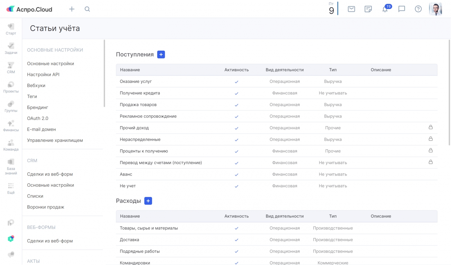 В Аспро.Cloud возможно добавлять финансовые подстатьи, а интерфейс раздела сделан специально для удобства работы со статьями учета. Добавляйте и группируйте статьи в зависимости от вида деятельности или типа операций. Например, пропишите необходимые подстатьи для логистики или производственных расходов. Вы можете запретить создавать транзакции для определенной статьи учета. При создании статей учета вы сможете:
