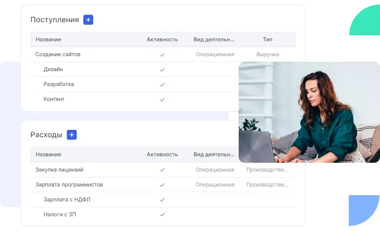 В сервисе удобно делить расходы на группы. Распределение происходит автоматически по заданным условиям. Становится понятно, куда именно уходят деньги — на производство, выплату кредита, налоги и так далее. Система автоматически формирует отчет о прибылях и убытках, собирает все поступления и списания в таблицах, а также рассчитывает чистую прибыль за период.