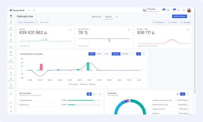 На одной странице Аспро.Cloud собирает оплаченные счета, поступления, расходы и остатки денег по всей компании