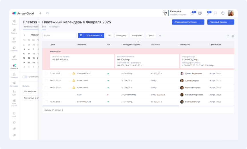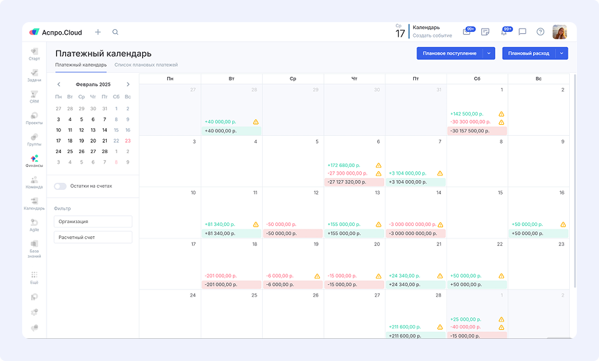В Аспро.Cloud есть встроенный платежный календарь. Так вы всегда будете знать, какие поступления и списания будут в компании и сможете вовремя к ним подготовиться.