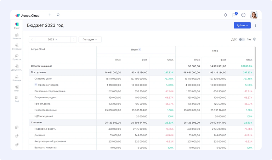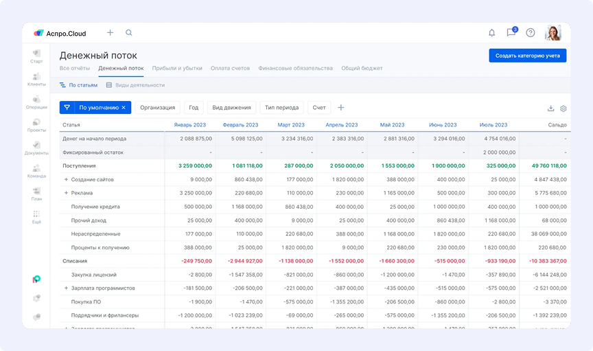 Все операции, которые проходят через банк, автоматически попадают в Аспро.Cloud. Он не только фиксирует суммы, но и сразу разделяет их по статьям учета. Когда деньги от клиента пришли на счета компании, они сразу отображаются в ОДДС и ОПиУ.