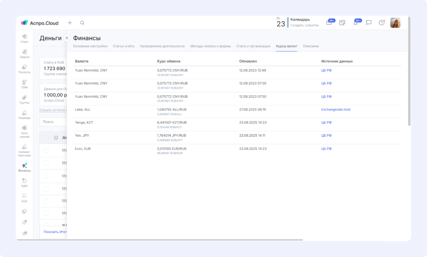 Если вы работаете с иностранными партнерами, вы можете формировать мультивалютные отчеты. Аспро.Cloud позволяет установить фиксированный курс для разных валют или учитывает стандартный курс курс ЦБ РФ.