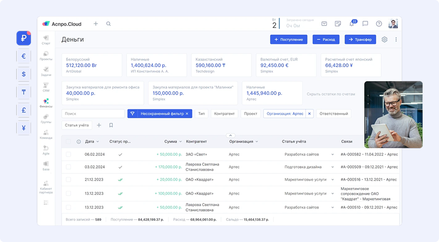 Аспро.Cloud — российская облачная система для управленческого учета, которая объединяет все бизнес-процессы компании. Модули сервиса, в том числе сделки, товары, задачи и проекты, связаны с деньгами, поэтому данные по этим сущностям отражаются в отчетах.
