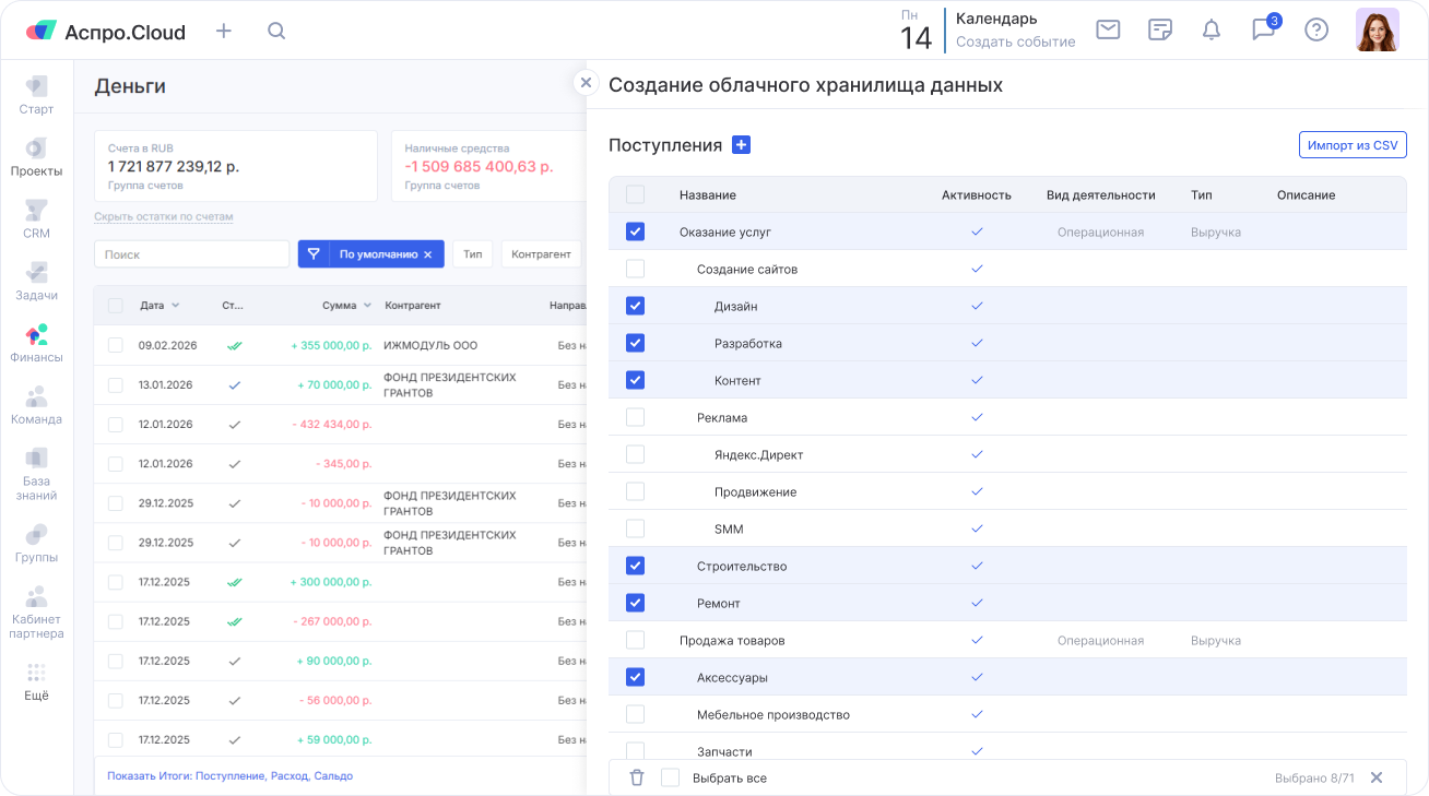 Система фиксирует все денежные поступления и списания. Но как отследить, за что пришла оплата? Для этого в Аспро.Cloud предусмотрены статьи учета, которые пользователь настраивает сам. Это помогает фиксировать поступления и списания с учетом особенностей вашего бизнеса. Выделите только те статьи учета, которые считаете важными и следите за их изменениями в режиме реального времени. Программа для учета финансов малого бизнеса Аспро.Cloud поможет получить контроль над денежным потоком.