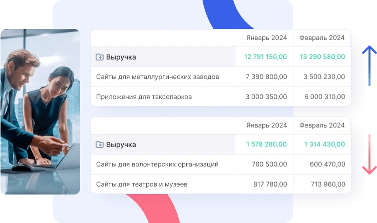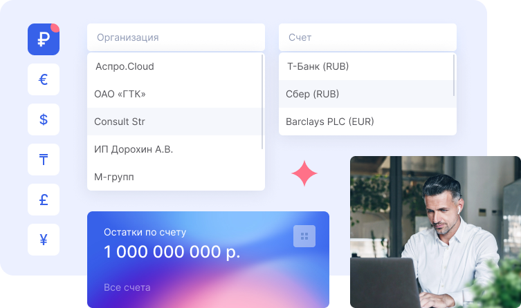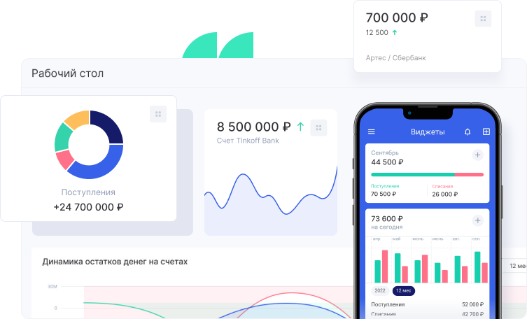 Настройте интеграцию с банком, чтобы все платежи загружались в систему в режиме реального времени. Аспро.Cloud синхронизирует данные по счетам, учтет все оплаты и расходы. Вы в любой момент сможете проверить свои финансы и быть уверены, что у вас на руках актуальные данные.
