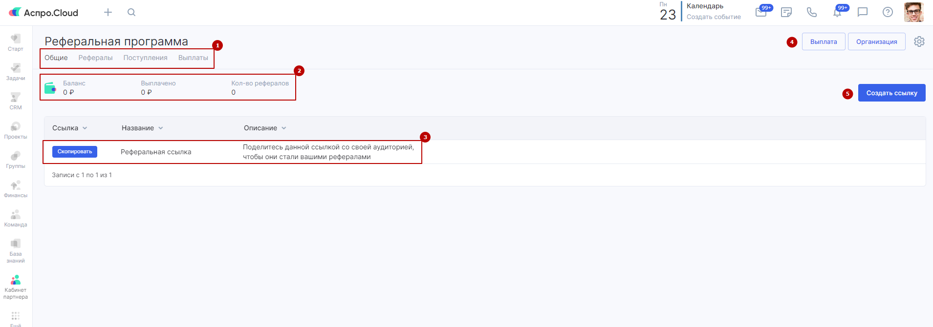 В кабинете реферальной программы будет собрана вся информация о ваших клиентах, балансе, выводах. Там же вы сможете создавать реферальные ссылки и приглашать по ним пользователей.