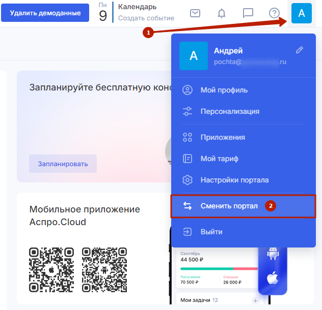 Для начала войдите в свой портал Аспро.Cloud, нажмите на иконку вашего профиля (1) в правом верхнем углу. В появившемся меню выберите пункт «Сменить портал» (2).