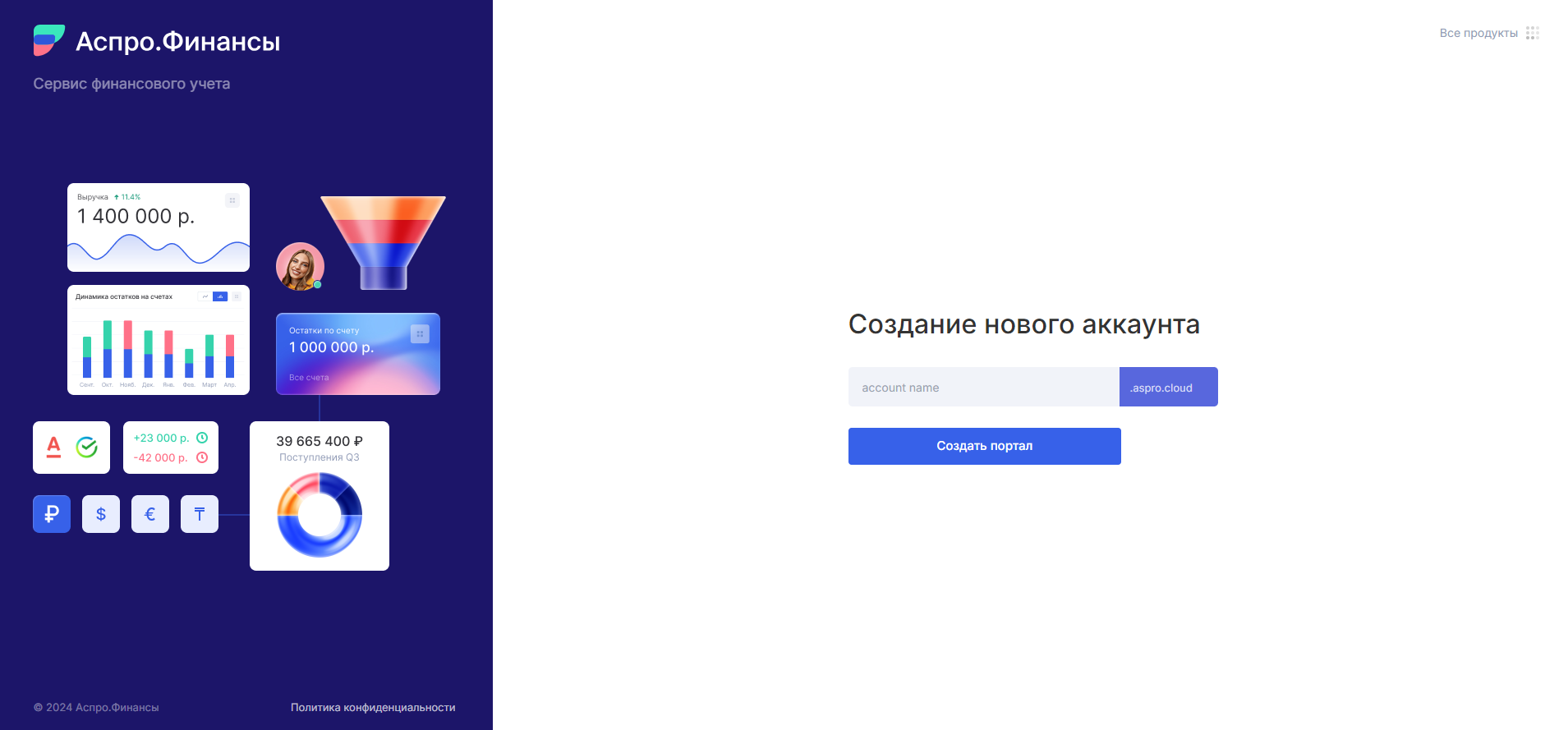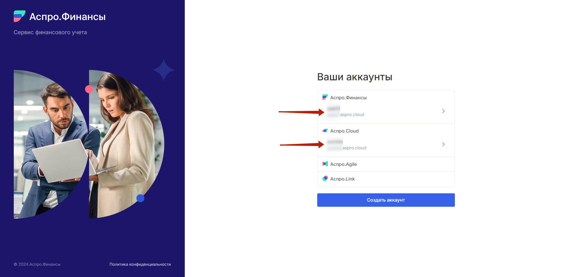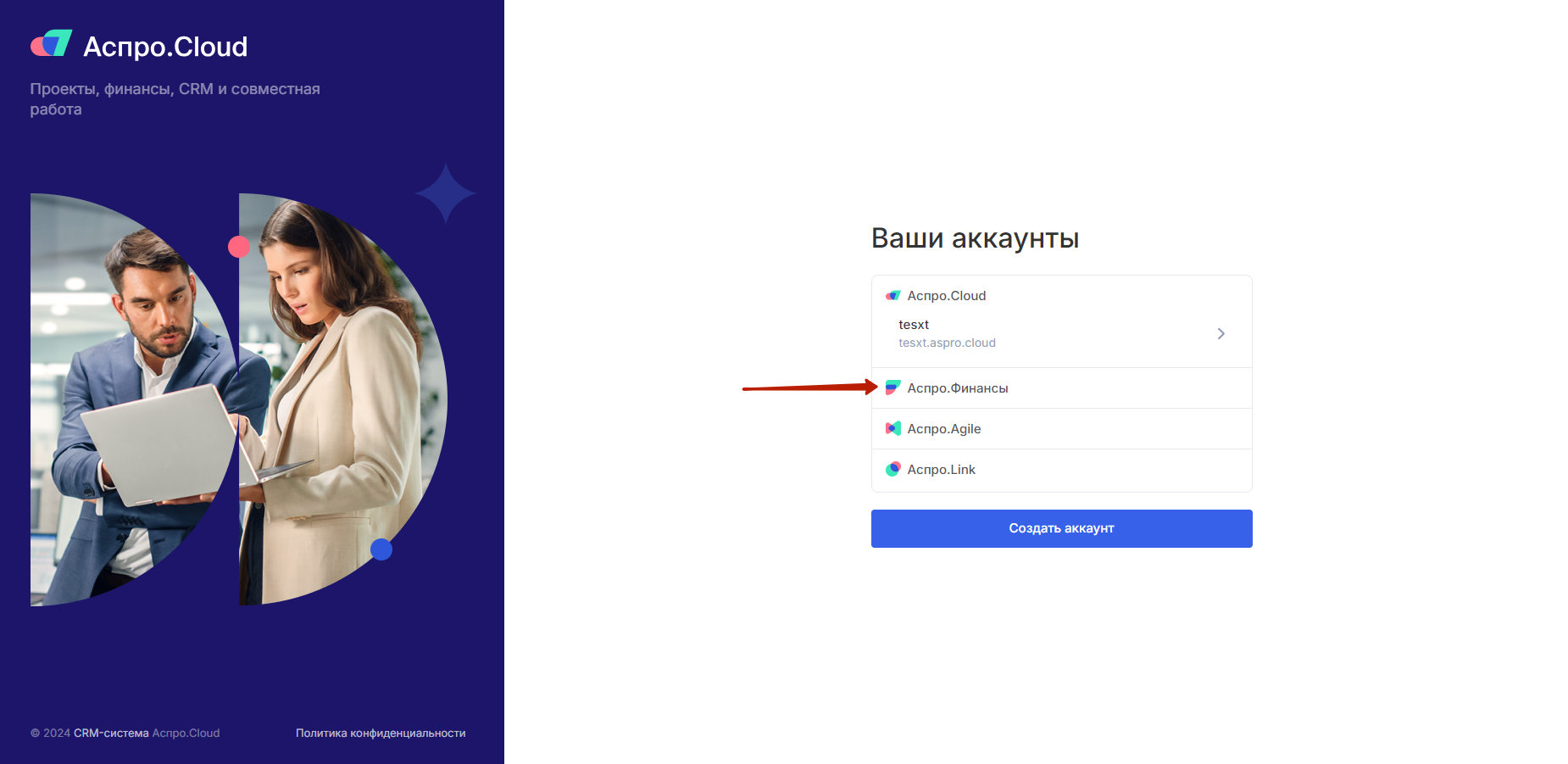 Вы перейдете на страницу общего логина в продуктах Аспро. Далее просто выберите нужный продукт, например, Аспро.Финансы.