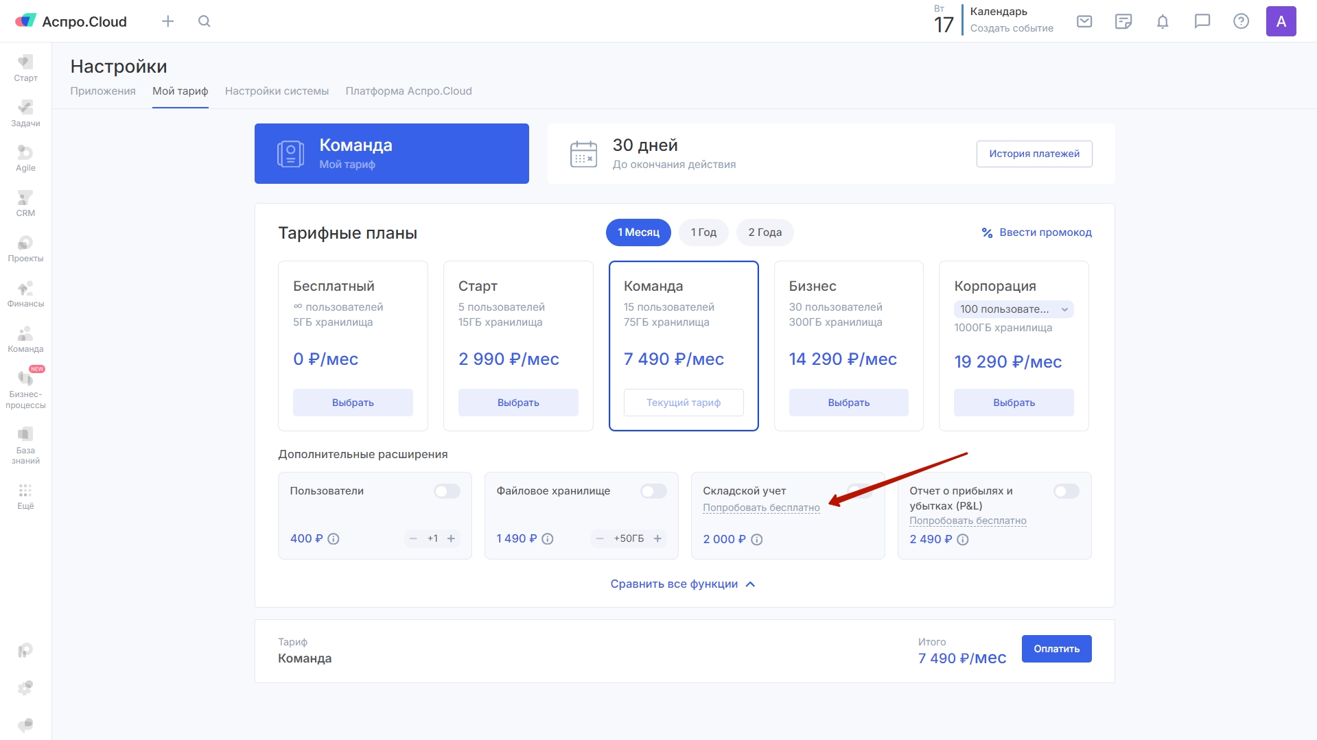 Список доступных к покупке расширений и их стоимость может различаться в зависимости от выбранного тарифа. К примеру, отчет P&L доступен для покупки на тарифах «Старт» и «Команда» — в тарифы выше он уже включен.