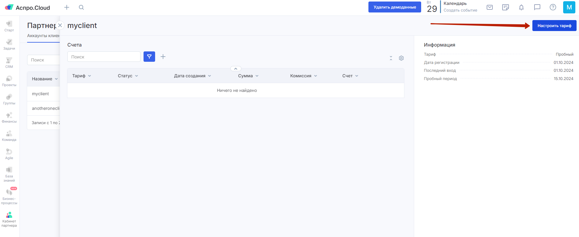 Чтобы выставить счет с расширениями, в партнерском кабинете выберите нужного клиента и нажмите кнопку «Настроить тариф».