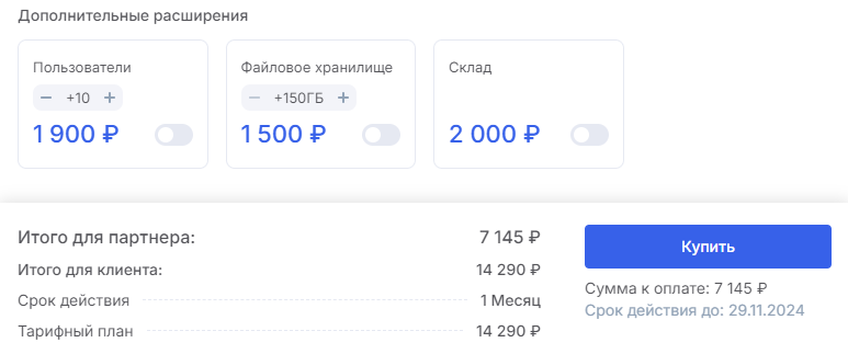 Участники партнерской программы также могут продавать расширения своим клиентам. Стоимость расширений включается в счет вместе с тарифом. Партнерское вознаграждение также будет пересчитывается с учетом расширений — процент на них такой же, как и на базовой стоимости тарифа.