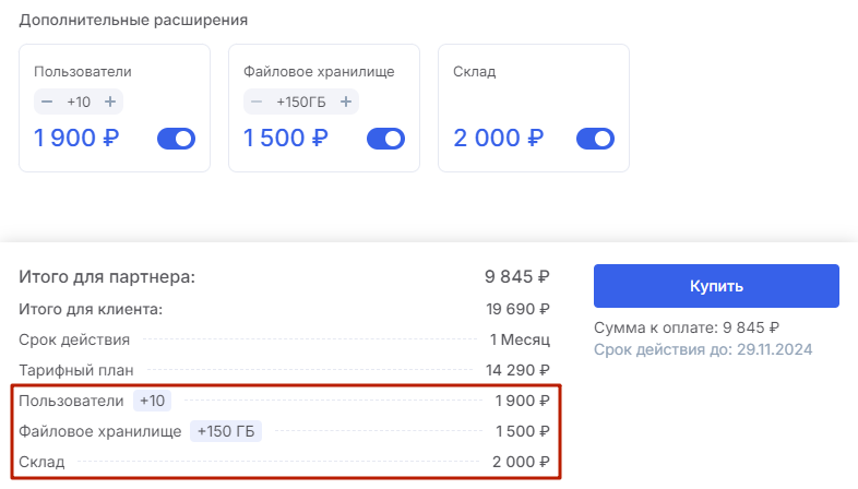 Выбранные расширения будут включены в счет, а их стоимость будет указана с учетом партнерской скидки.