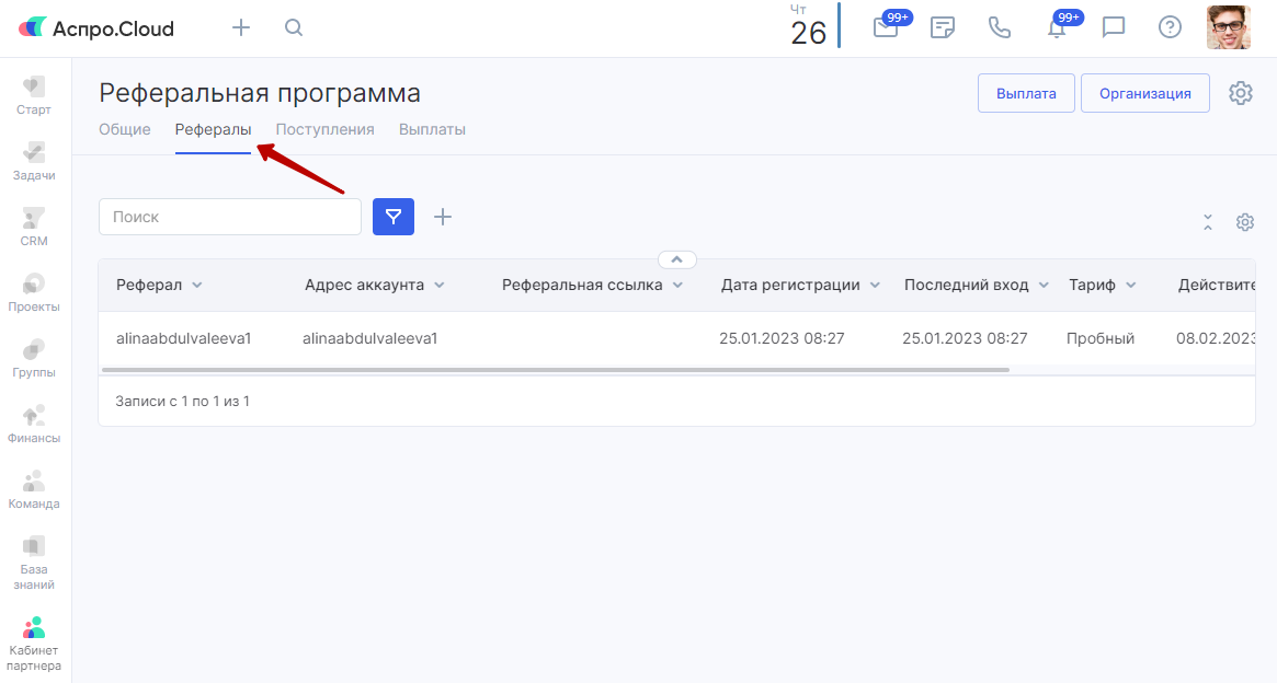 После регистрации в системе пользователь появится в вашем списке рефералов. Будет указано название реферальной ссылки и информация об аккаунте.