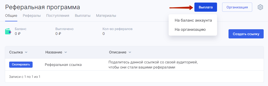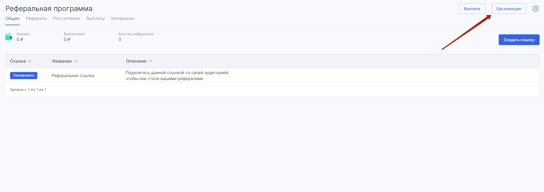 Перейдите в модуль партнерского кабинета, в раздел «Реферальная программа». В правом верхнем углу нажмите кнопку «Организация».