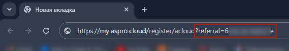 По умолчанию генератор ссылок создает ссылки на экран регистрации. Чтобы привести клиента на сайт Аспро.Cloud или какую-то отдельную его страницу, достаточно добавить идентификатор вашей реферальной ссылки к нужному URL-адресу.