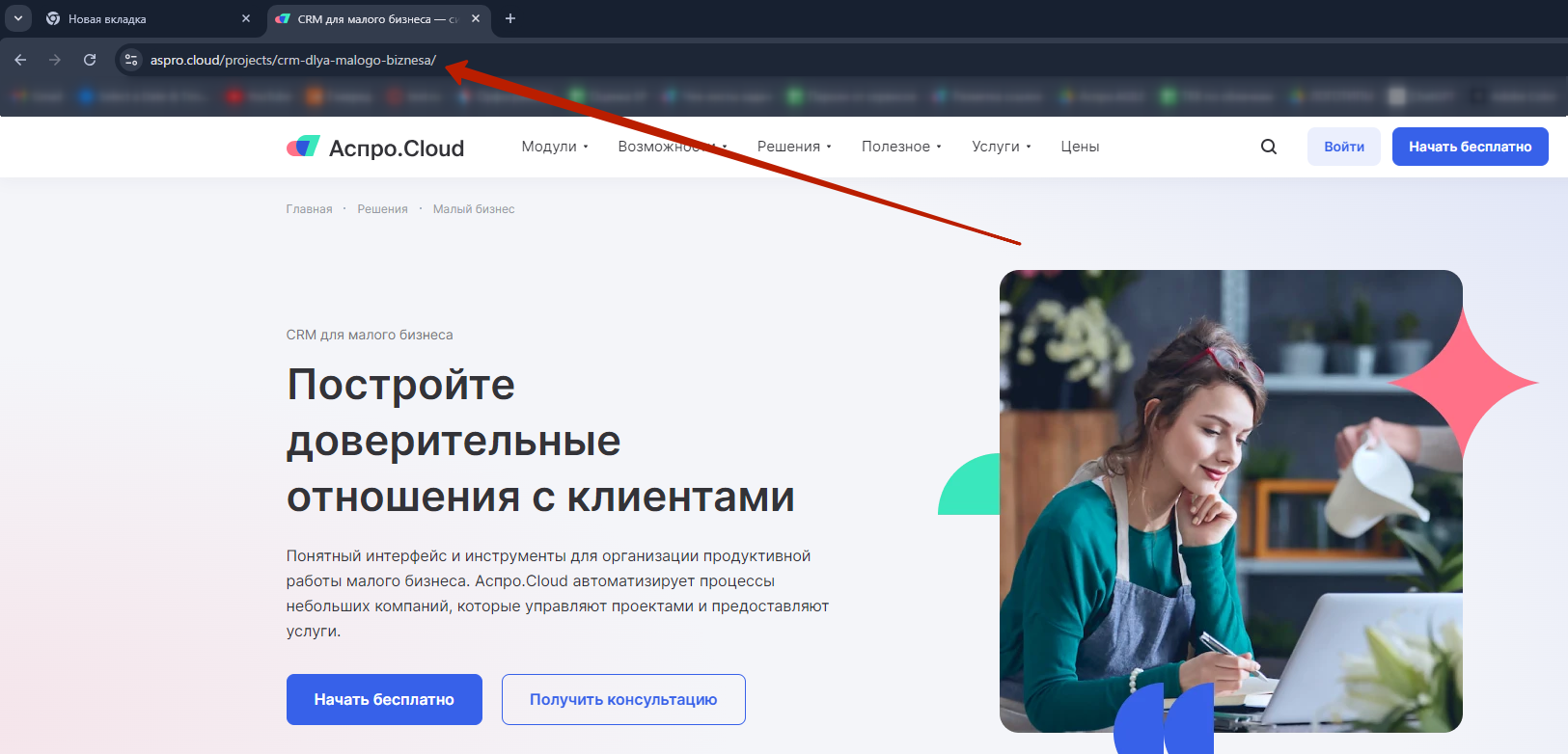 4. В другой вкладке браузера откройте сайт Аспро.Cloud или Аспро.Финансы. Скопируйте ссылку на нужную страницу сайта. Вставьте ее в другое текстовое поле.