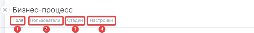 После сохранения данных откроется окно с настройками бизнес-процесса, которое включает в себя 4 раздела: