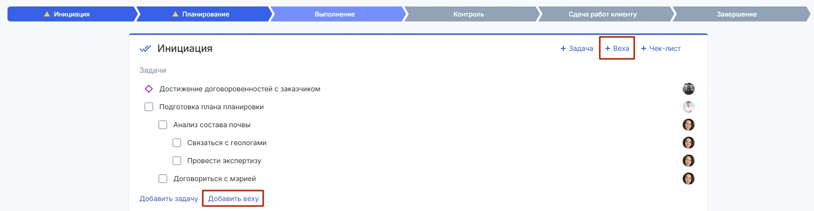Чтобы добавить веху в проект, наведите курсор на этап и нажмите на одну из кнопок добавления вехи.