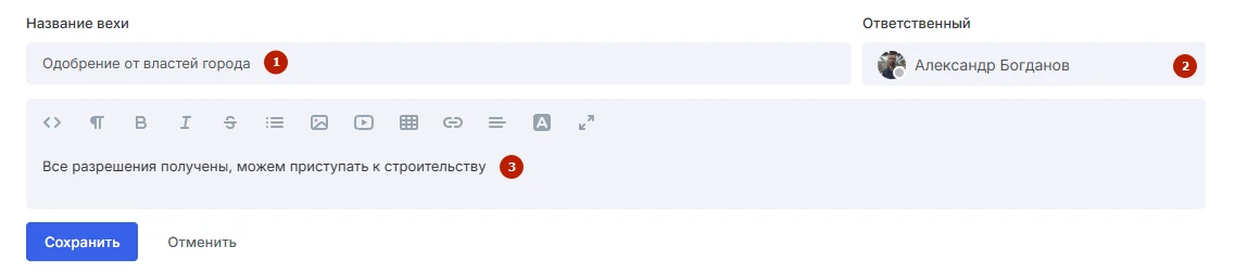 Форма создания вехи выглядит аналогично пункту чеклиста. Для добавления вехи: