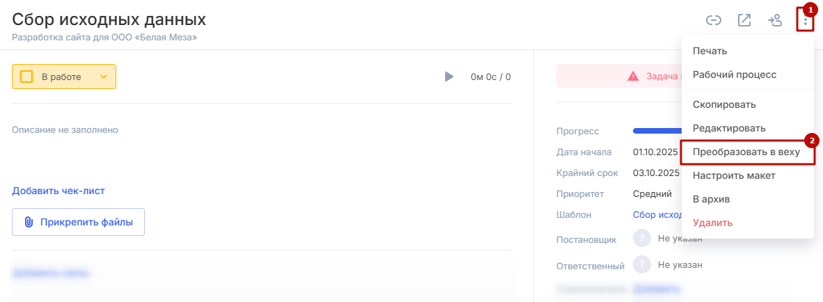 Внутри проекта, в разделе «Порядок работ» перейдите в любую задачу. Откройте контекстное меню (1) в правом верхнем углу и выберите пункт «Преобразовать в верху» (2).