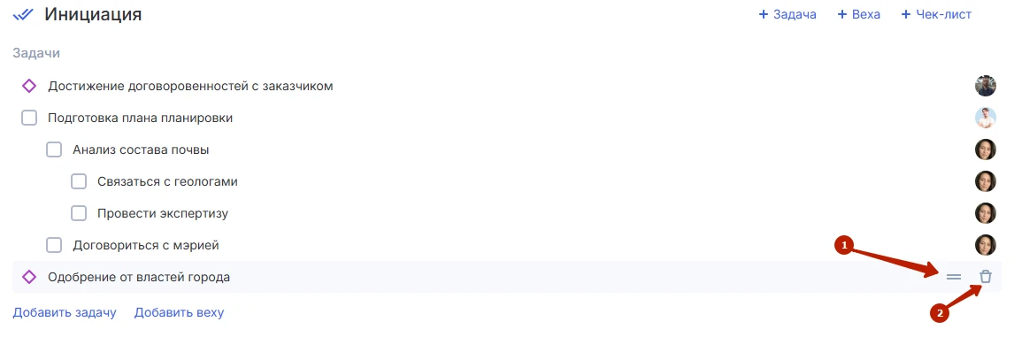 Веха появится в чеклисте. Отмечать ее не нужно. Для перемещения вехи по порядку чеклиста (1) или ее удаления (2) наведите курсор на веху и нажмите по соответствующей иконке.