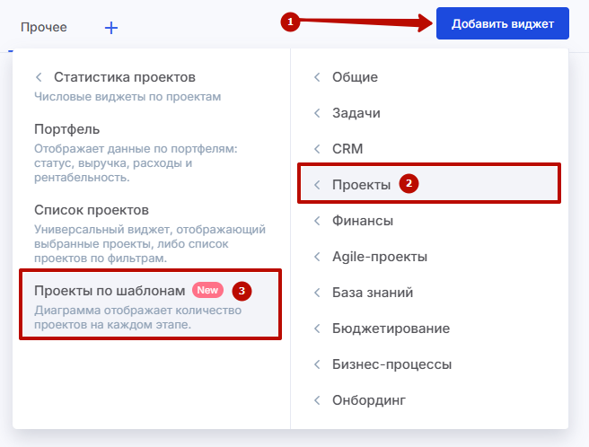 выберите виджет «Статистика проектов» (3).