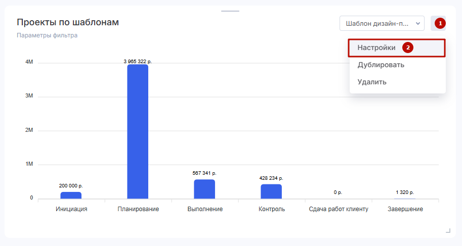 Виджет выводит в виде диаграммы выбранный шаблон с порядком работ, распределяет текущие проекты по их этапам и отображает следующие данные: