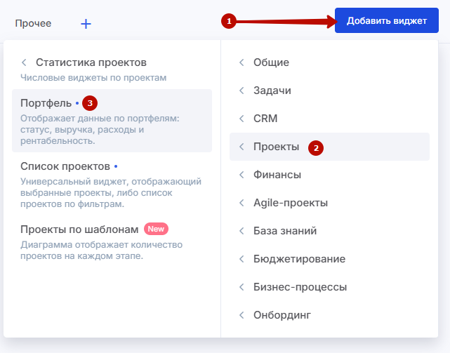 во вкладке «Проекты» (2) выберите виджет «Портфель проектов» (3).