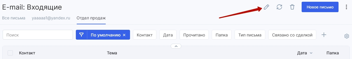 Чтобы отключить интеграцию с почтовым ящиком, перейдите в модуль «Почта» через иконку в верхней части экрана. Нажмите на иконку редактирования.