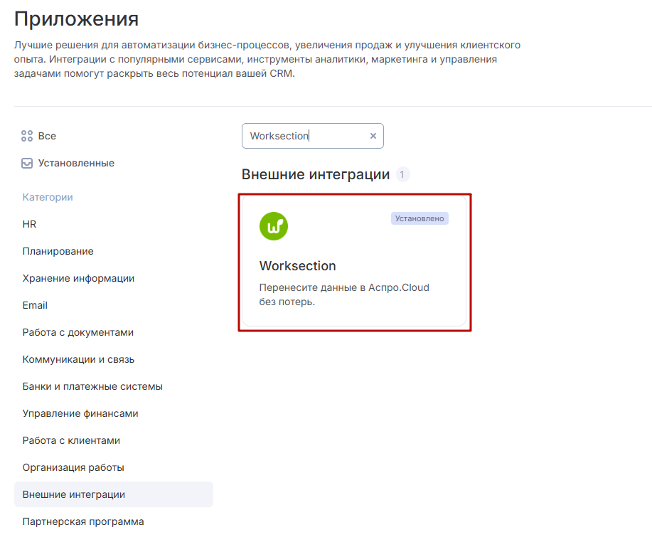 Перейдите в «Приложения», найдите модуль интеграции с Worksection и установите его.