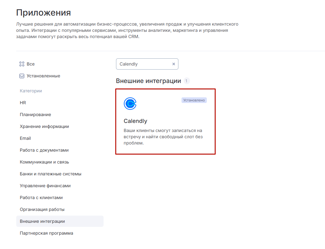 Перейдите в «Приложения» и установите интеграцию Calendly.