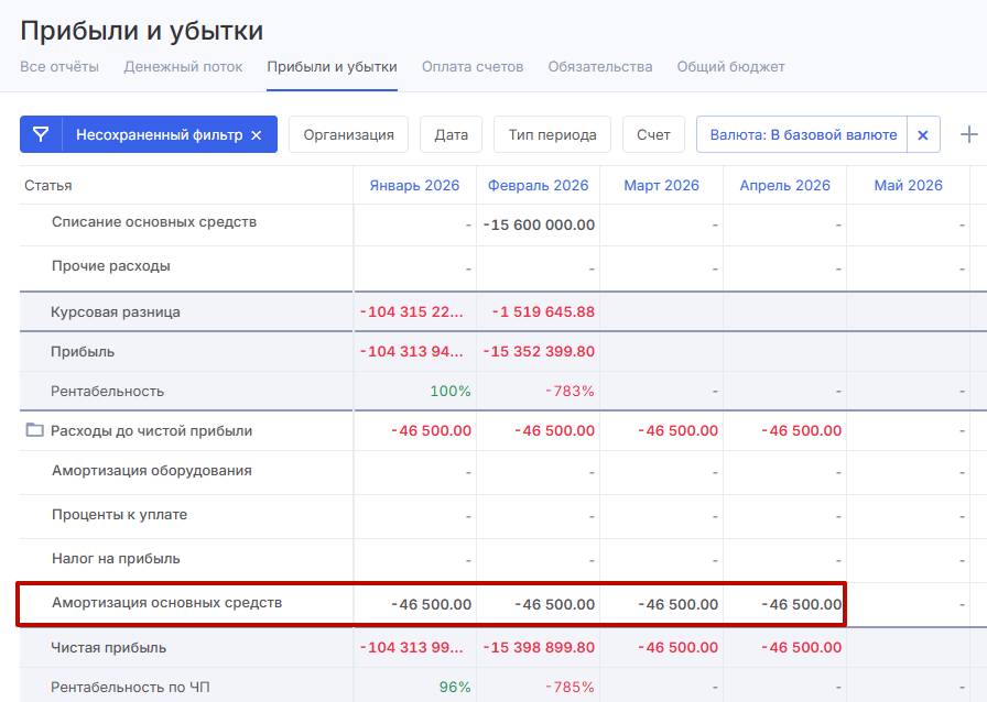 В модуле «Имущество» при добавлении активов вы сможете сразу указать сумму и период амортизации. Амортизационные отчисления будут отражены в отчете ПиУ.