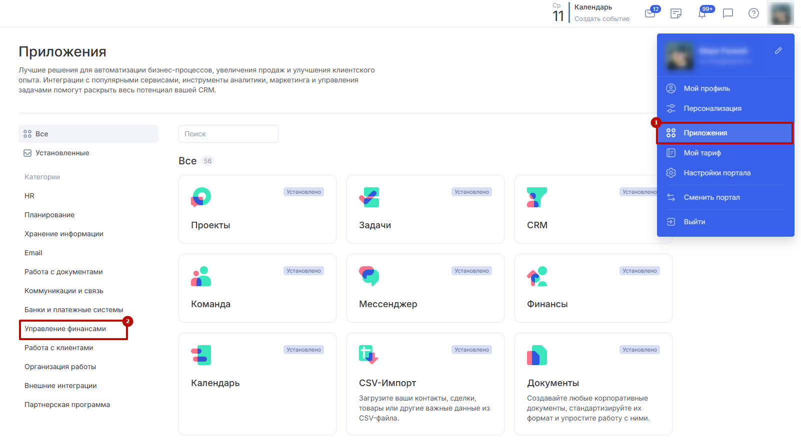 Для установки перейдите в раздел «Приложения» (1) → «Управление финансами» (2) или воспользуйтесь поиском.