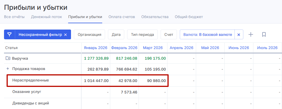 Данные о платежах по обязательствам также отображаются в отчете «Прибыли и Убытки» — в зависимости от привязанной статьи учета.
