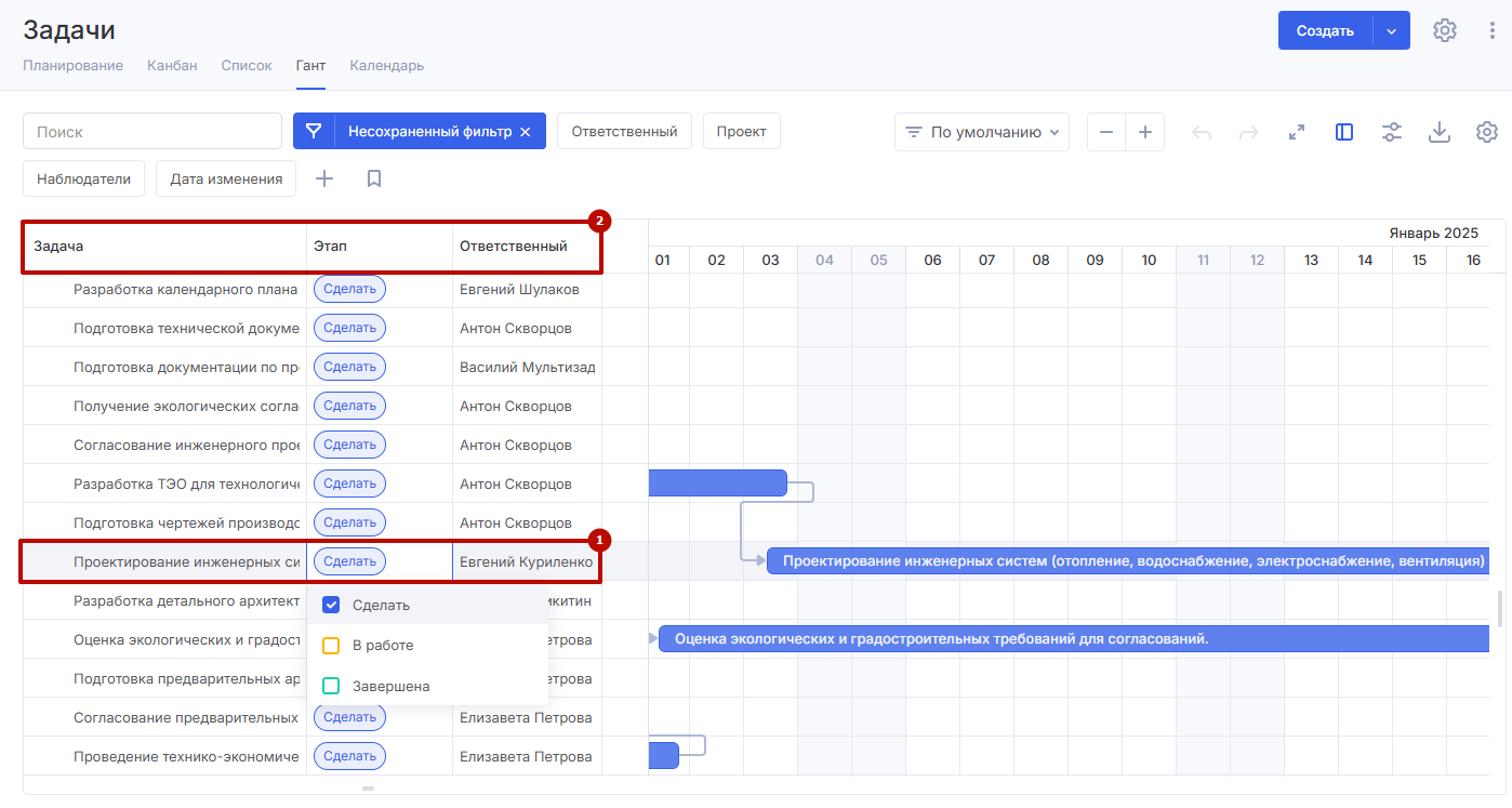 Поскольку на диаграмме Ганта при первом посещении будут отображены все актуальные задачи, используйте фильтры — они расположены над диаграммой.