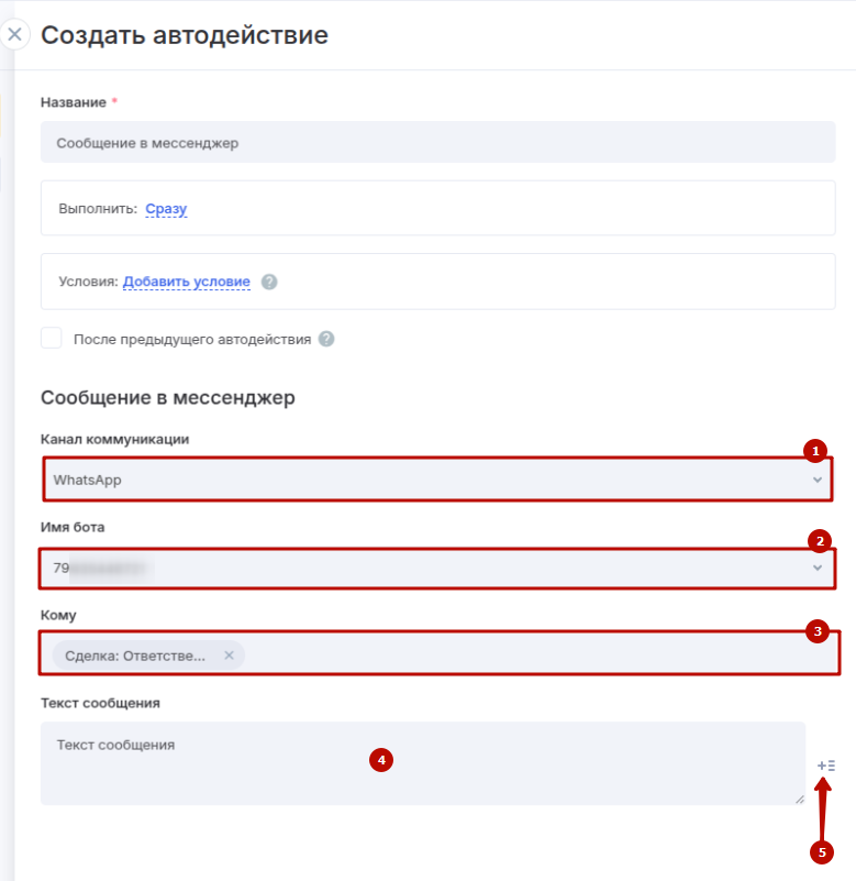настроенная интеграция с соответствующим мессенджером — Whatsapp*.