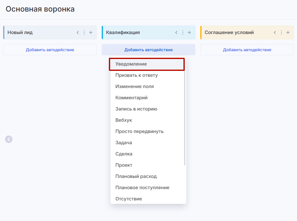 На экране «Автодействия» в воронке продаж выберите нужный этап и добавьте автодействие типа «Уведомление».