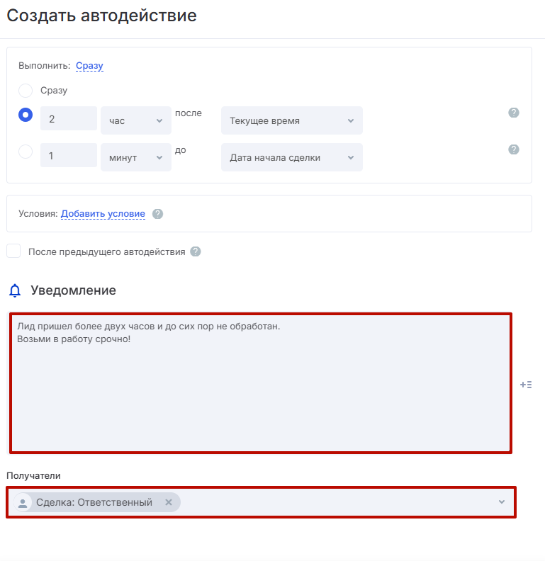 получателей — вы можете указать как конкретных пользователей, так и выбранного ответственного по сделке или человека, добавившего ее в воронку.